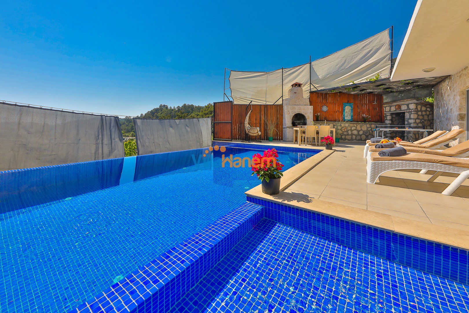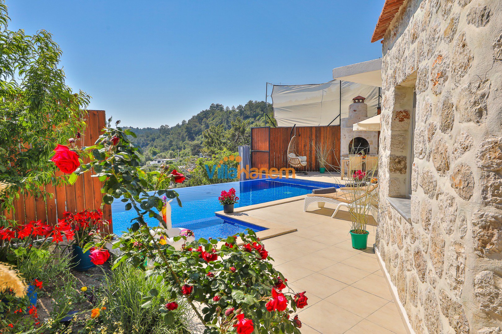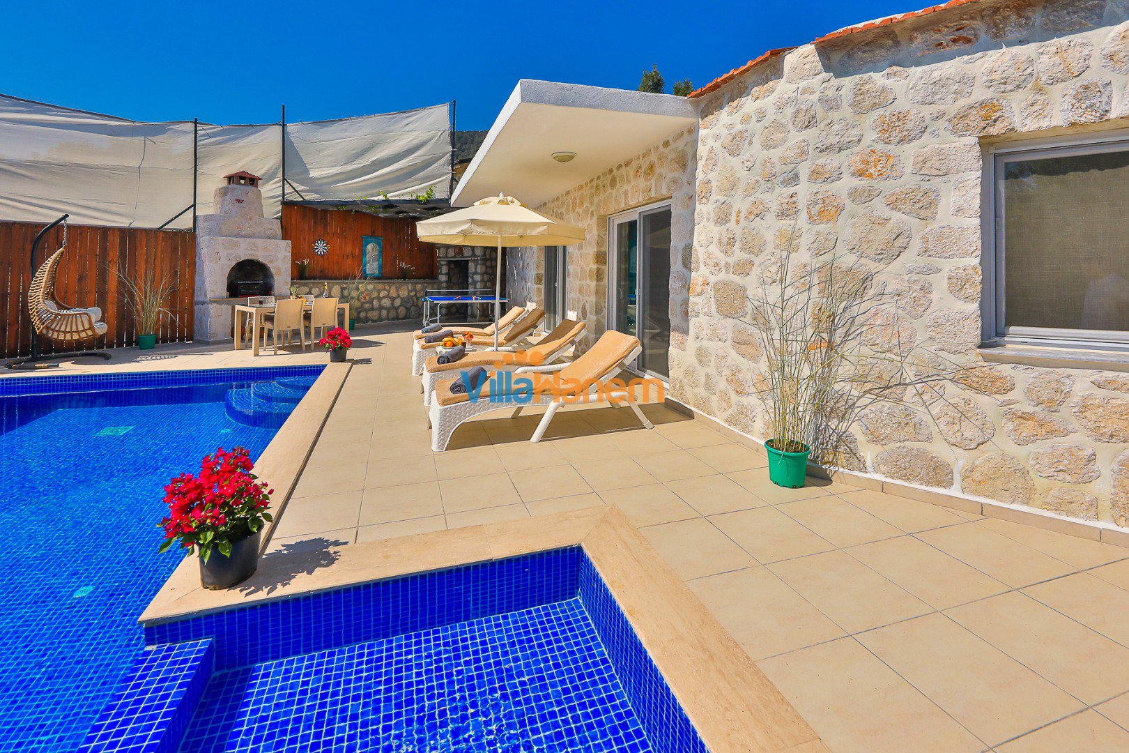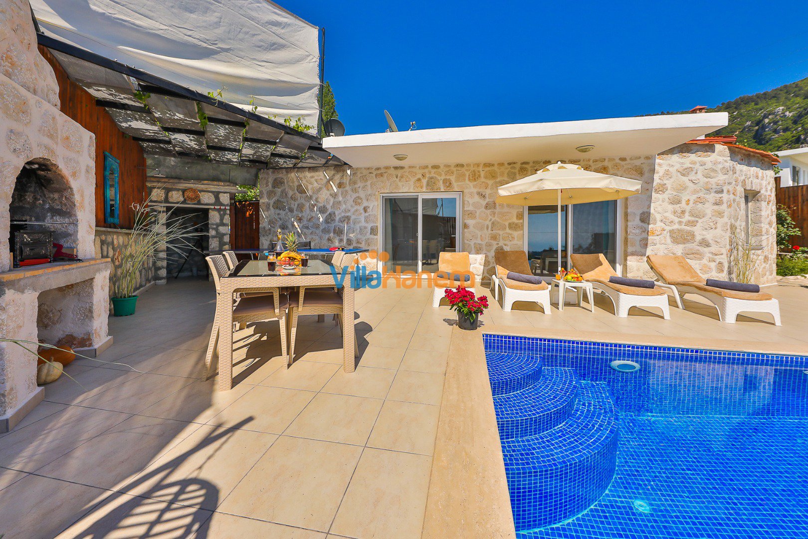 Kalkan İslamlar mevkiinde konumlanmış kiralık balayı villası, muhteşem doğa manzarası ve taş konsepti ile huzurlu ve konforlu bir tatil isteyen konuklarımız için en ideal seçeneklerden bir tanesidir. Villamız muhafazakar villalar ve balayı villaları kategorisinde yer almaktatıdir. 2 yatak odası ile 4 kişiye kadar konaklama imkanını sizlere sunmaktadır. Villamızda bulunan masa tenisi, çocuk havuzu dikkat çekmekte. Ebeveyn odasında bulunan çift kişilik jakuzisi de extra rahatlama imkanı sunmaktadır. Havuzu korunaklı (Havuzun dışarıdan gözükmediği anlamına gelir) özelliği ile mahremiyete önem veren misafirlerimiz için önü kapanmayan manzarada tatil imkanı sunmaktadır.